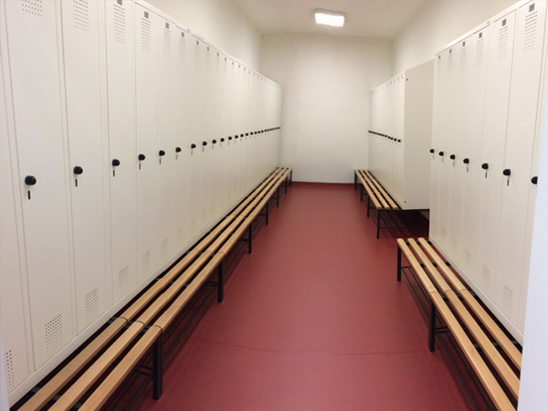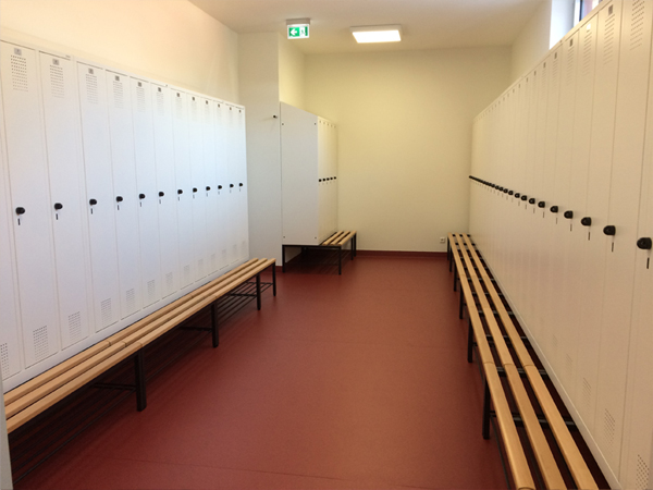 Zusätzlich wurden die Umkleideschränke mit Schrägdächern verbaut damit keine Gegenstände auf den Spinden gelagert werden können.